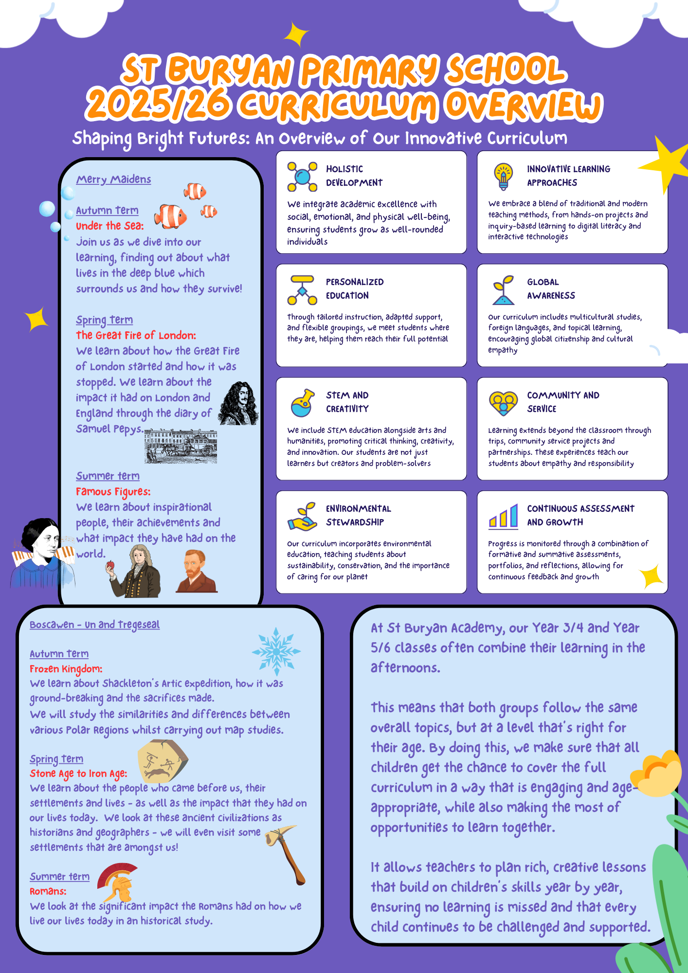 With mixed-age year groups, curriculum design can be challenging; however, we are passionate and proud of the curriculum we offer at St Buryan Academy, which you can view below.